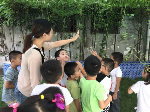 参观小菜园,藤蔓架子上面有高高挂起的葫芦,有的葫芦有两节,有的葫芦还只是一个小小的圆形。他们好奇的用手摸了摸毛茸茸的葫芦藤蔓并且还闻了闻。藤蔓的一角还有牵牛花,真是万绿丛中一点红。孩子们还发现了什么呢?长长的大叶子,叶子绿油油的,原来下面种的是芋头,上面茎茎叶叶的纹路清晰可见......于是,我们班围绕着小菜园开展了一系列孩子们感兴趣的活动:“藤蔓植物调查表”、菜园写生、我找到的藤蔓植物等等。