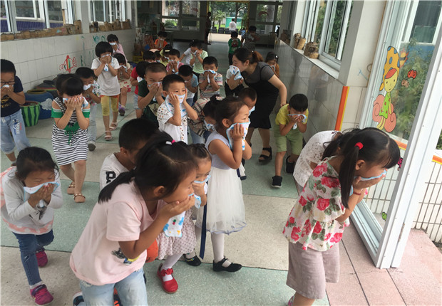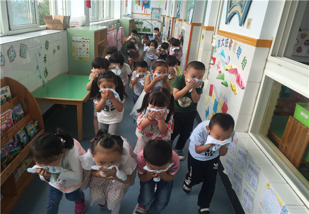 上午10点,急促的警报声突然响起。各班教师迅速按紧急预案的疏散线路带领幼儿拿起湿毛巾,捂住口鼻,弯腰小步快走,分两道楼梯迅速且有序下楼。途中,孩子们安静且井然有序。很快孩子们集中到户外安全地带,教师迅速地清点人数,整个疏散活动只用了3分多钟,做到了快速、安全、有序。