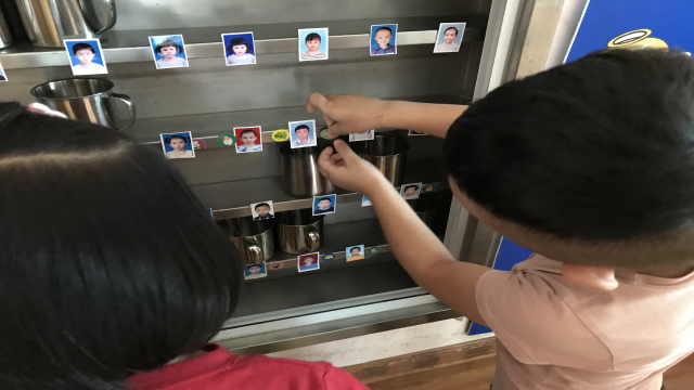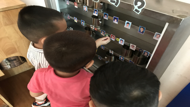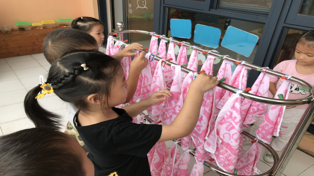 怎样让孩子一人一巾,认清自己的杯子、床铺等,在幼儿园养成良好的生活习惯呢?我们利用生活中随处可见的五颜六色、各种各样的小标记,通过这些标记,让幼儿认清属于自己的一套生活用品。“小”标记起了“大”作用,宝宝们自己为自己的杯子、毛巾、椅子、床等都做上标记,贴上同款的自己喜欢的贴纸,很快,孩子们都能找到而且又快又准确,从而帮助了小班幼儿认清自己的物品。另外,让幼儿们一人一物,也使得生活更加卫生。