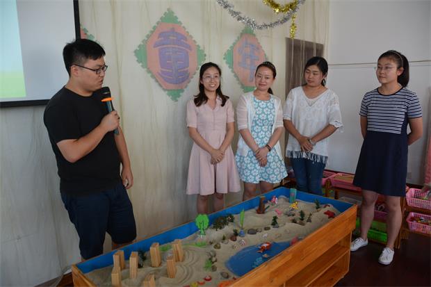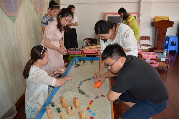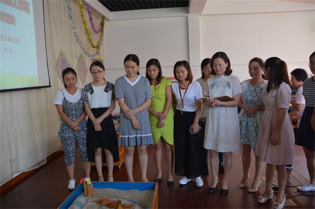 本环节围绕东青幼儿园蒋惠娟园长分享课程游戏化经验展开。活动伊始,蒋园长就借助趣味横生的沙盘游戏,把全体参与者带入“研”之氛围。在半个小时的游戏体验中,老师们自由分组,自主选择“游戏者”“观察者”“交流者”等不同角色,象孩子一样去与沙嬉戏,感受着无与伦比的放松与自在,爽朗的笑声不时地在活动室回旋。体验结束,老师们真情流露:“这样的教研氛围很轻松,我们真正玩嗨了!”最后,蒋园长结合东青幼儿园课程游戏化实践经验,给出了中肯的点评与指导。
