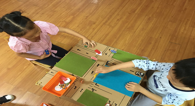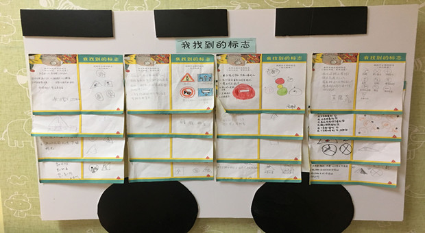 活动中,通过安全主题谈话让幼儿发现自己身边的安全标志,随后教师带领幼儿认识生活中的各项安全标志,分析这些安全标记图的图案特征,了解这些标记所包含的实际意义。在感知禁止标志和警告标志的特征后,教师引导幼儿尝试设计安全标志,并把幼儿的作品张贴到主题墙上。与此同时,我们还和幼儿一起设置了与标志相关的区域游戏,如益智区的趣味魔方、建构区的在马路上等。