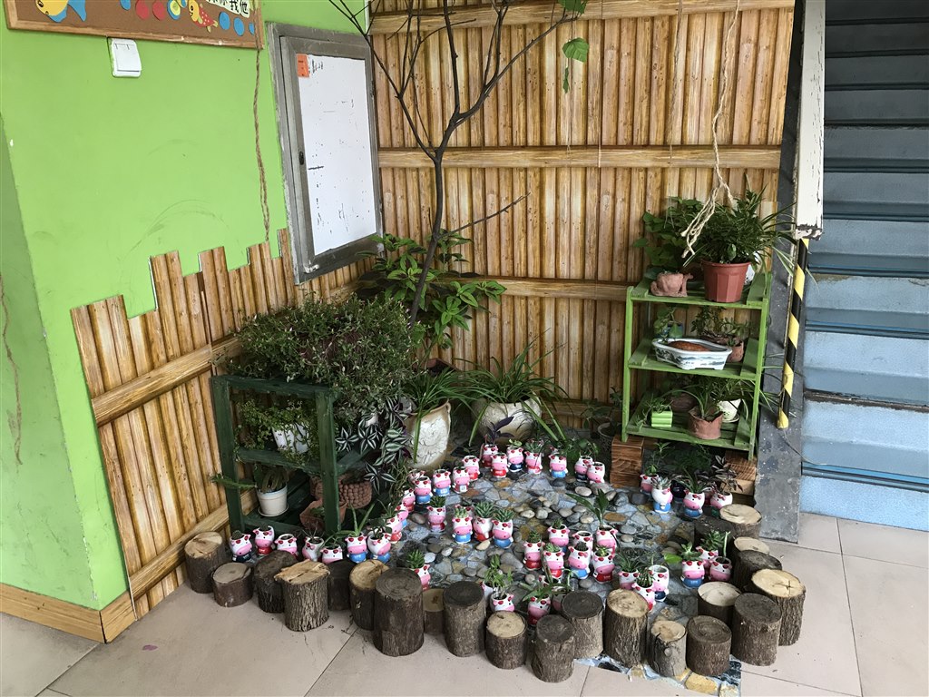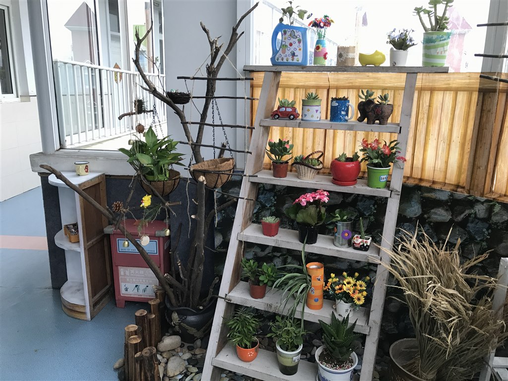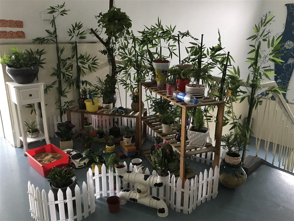 瞧!女老师们都成了女汉子,把废旧的鞋架,用榔头和锯子进行了改造,重新涂上了素雅的白色,枯枝、落叶、鹅卵石、木桩等都成了小景观里有生命的一花一世界,仿佛把大自然浓缩在小小的角落里,软陶制作的小动物快乐地坐在老师新手制作的秋千下荡秋千,充满童趣与快乐,深深地吸引了孩子们的目光。孩子们积极地参与到环境创设中来,他们与家长一起收集各种自然材料,有的带来了玉米、青竹;有的带来红砖、鹅卵石;有的带来鸟窝、稻草等,和老师一起装饰、布置这些小小的角落,孩子们自己在小瓶小罐子里种上多肉、小花小草等,装点着这块小角落。