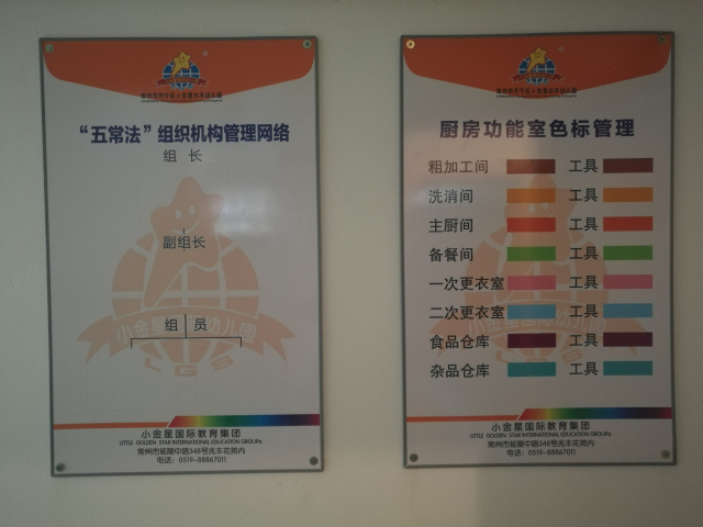 首先,园领导和后勤人员结合本园食堂空间的构造,精心部署积极筹备,增设了粗加工间、烹饪间、备餐间、洗消间等每一个间,划分了食堂各类物品摆放的位置,洗菜池、刀具、菜筐、抹布等放置处都张贴了新制作的标志牌。其次,在食堂管理原有的基础上进一步制定了规章制度,确定各区域卫生负责人,强化责任意识,确保幼儿园食堂卫生安全。真正体现出“常整顿、常清洁、常自律、常检查、常分类”的五常法管理精髓。