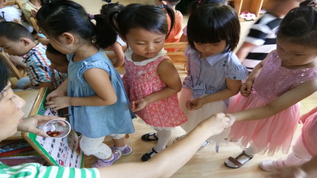 每个孩子有三粒种子,有的是绿豆、有的红豆、还有的是蚕豆、花芸豆、黄豆、黑豆,这不同豆类的六组小朋友可以将豆宝宝进行比较。孩子们通过学号找到了属于自己的杯子。他们将餐巾纸折叠后作为豆宝宝需要的“土壤”放入杯底,并能及时为豆宝宝浇水。每个孩子都有一本自己的观察记录本,他们需每天去看一看自己的豆宝宝有没有变化,如果有变化就将它的变化以图画的形式记录下来,每个孩子都是小园丁,都有他(她)需要照顾的豆宝宝,提高了孩子们的观察记录能力!