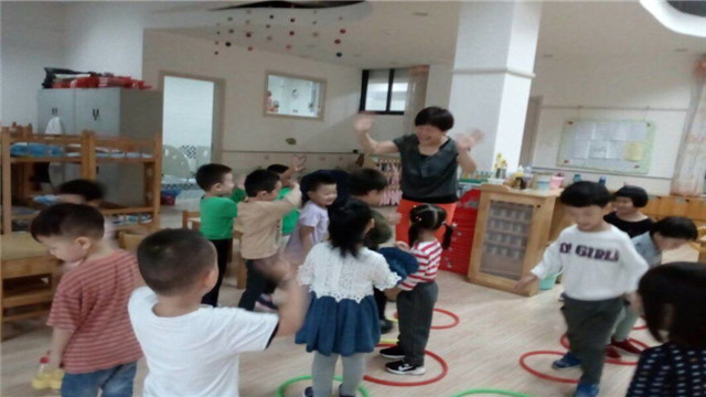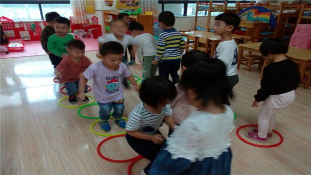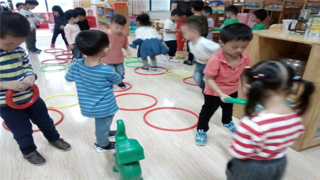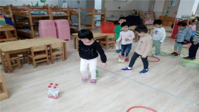 瞧!教室里创设了呼啦圈,孩子们可以用呼啦圈玩各种玩法,放在地上排成排,学着小兔子跳跳跳。把呼啦圈竖起来,学着小狗钻钻钻。把呼啦圈甩一甩,就把大象鼻子套套套。塑料瓶间隔放,变成小树一排排,让孩子们在林间快乐地穿梭。教室里的桌子、椅子也能成为孩子们的运动器械,孩子们可以在桌子底下玩“钻山洞”,用皮筋把椅子连起来玩“跨栏”……