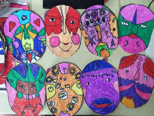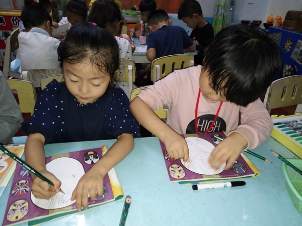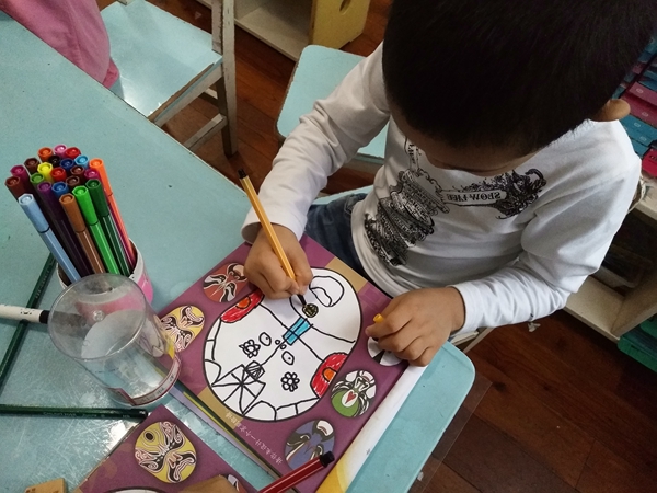 在这个主题《自信的中国人》中,我们带领孩子仔细观察了京剧脸谱,了解其左右对称的特征。在第一节课中,孩子们给脸谱涂色,很快,一个个孩子都拿着涂好的脸谱给老师看,我问他们:“你们觉得涂色对你们来说难吗?”孙雅琪说:“老师,涂色一点都不难,你看我涂得好吗?是左右对称的哦”。“我的也是对称的”。小朋友们互相争着要给我们看。“是啊,你们涂得真好,颜色都对称了,而且也涂均匀了,说明涂色对你们来说太简单了,那你们为什么不尝试一下两颗星的难度呢?”孙雅琪有些不好意思地说:“两颗星有点难,我怕我画不好。”我笑笑说:“你没尝试过,怎么知道自己不行呢?试试看吧,说不定你会发现自己原来更棒哦!”于是琪琪拿起只画了半张脸谱的画纸,开始尝试两颗星的难度,不一会儿也完成作品的徐梅馨也加入到两颗星的难度挑战当中。再后来很多小朋友直接在空白纸上大胆设计着不同的脸谱。完成后,孩子们欣赏着各自创作的脸谱,分外自豪。
