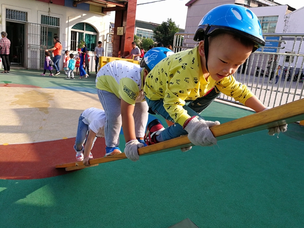 大多数孩子在一个脚跨倒另一头时,都比较的紧张。在我们适当的帮助与鼓励下,都能比较顺利的完成攀爬。在攀爬过程中,我们强调双手必须抓住铁杆,不要放手,并且告诉他们,我们在你们可以尽管放心,因为我们会保护你们的。当有的孩子在跨的这个过程中产生胆怯心理的时候,老师的一个适当的帮助,给了他们更大的信心,同时下面的孩子们也会大声的为他们加油。一轮下来,各个孩子都进行了攀爬的挑战。其中有3个孩子不用老师帮助,就能独立完成攀爬。