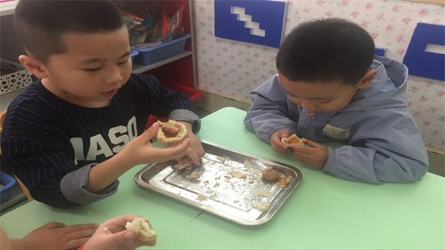 活动伊始,老师通过实物介绍,带领幼儿了解制作工具和月饼的材料,并通过观看视频,熟悉制作工序,小朋友们都兴致勃勃、跃跃欲试。在老师的指导下,他们有的称重,有的和馅,有的揉面,有的擀皮,最后包入鲜鲜的猪肉,圆圆的月饼就做成了。最后,大家一起品尝月饼,感受传统的中国文化。 此次活动,加深幼儿对中华传统民俗文化的认识,更让他们学会分享,体验劳动带来的乐趣,在动手操作、大胆探索、与他人分享中茁壮成长。
