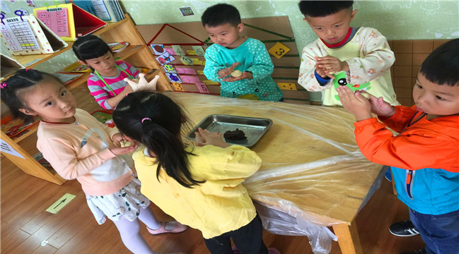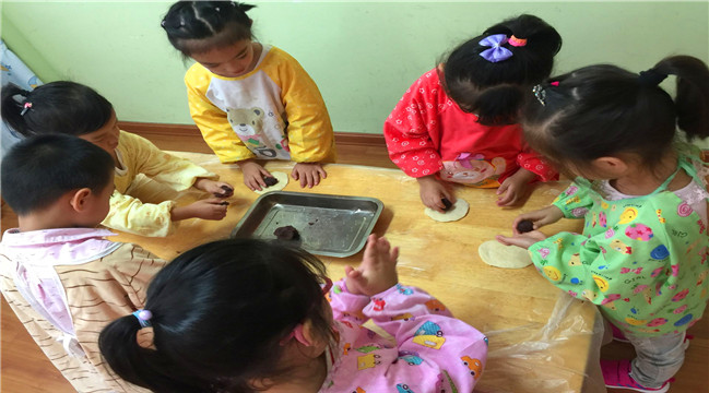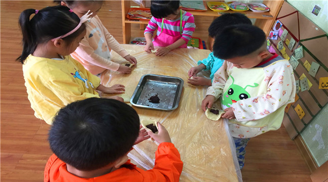活动开始前,教师将制作月饼所需的原料都准备到位,为孩子们共同参与“做月饼”做足了准备。活动中,孩子们穿好护衣、将小手洗干净,并在教师的引导下投入到制作月饼中,称好面团和馅料,把面团放到手心里揉一揉,让馅料躺到面皮里包好,然后放到模具里用力一压,一个个漂亮的月饼就做好了。当孩子们看到自己做出的月饼的时候,孩子们兴奋的发出惊叹和欢笑。