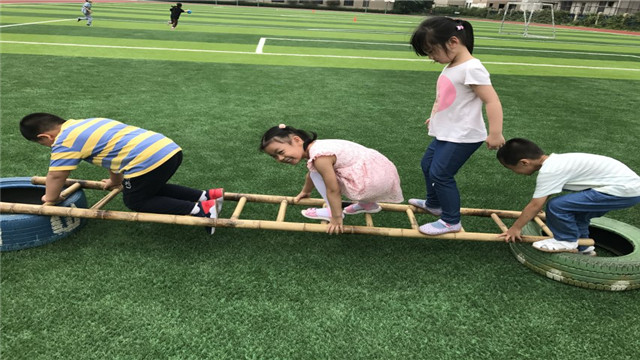 合作互助,快乐学习的氛围促进孩子们健康成长,自制游戏器械的参与,让孩子们兴趣高涨,活动中,幼儿自主互助、专注投入、欢呼雀跃、快乐无比。幼儿的身心、情感在活动中得到了健康、愉悦的体验。(夏逸芸)