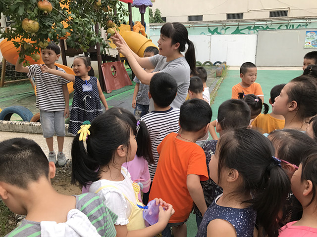 孩子们在老师的带领下,依次展开了观察石榴、采摘石榴、品尝石榴等活动内容,由于石榴长得有点高,老师摘下来,小朋友们再把摘下来的石榴,轻轻地放入准备好的盆中,孩子们非常高兴,处处洋溢着他们的欢歌笑语。