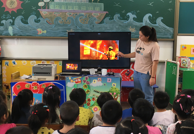 活动中,教师首先通过视频、PPT以及师生互动的方式,让幼儿明白在火灾中正确的逃生的方法和如何使用灭火器等相关的安全知识。家长们将消防安全知识讲述给孩子听,幼儿则将自己印象中的消防车、灭火器、消防员、119电话、云梯等消防安全知识用图画的形式表现出来。通过本次亲身体验,切实增强了孩子们的消防安全意识、掌握了消防安全知识,提高防范能力和初步的自救能力,有力地促进了幼儿园安全教育工作的开展。