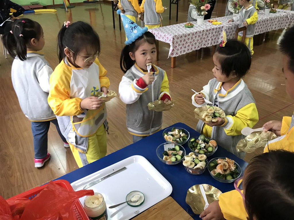 我们幼儿园每周都开展蒙氏混龄活动,正好利用本周混龄活动时间让大班的哥哥姐姐一起参与为甜甜小朋友准备生日party。大班的哥哥姐姐制作自助餐,他们分工明确,有的制作沙拉,有的制作生日面,有的布置环境,还有的负责摆盘等等。在哥哥姐姐的忙碌中,很快生日自助餐完成了。他们邀请甜甜以及小二班的所有小朋友一起分享,大家一起唱生日歌,送祝福。同时,哥哥姐姐细心的带着弟弟妹妹们一起吃自助餐,为他们夹菜倒饮料等等。