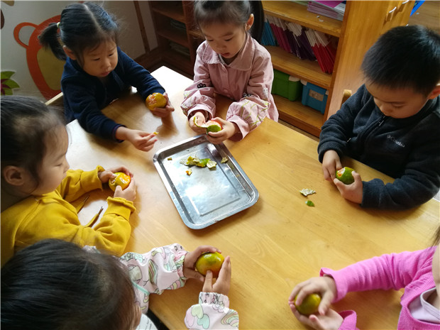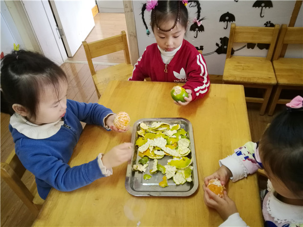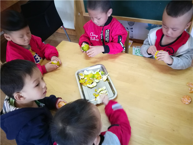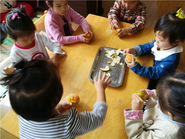 首先,老师告诉幼儿,桔子是农民伯伯付出劳动辛辛苦苦种出来的,然后让幼儿知道想吃到美味的桔子必须要自己动手剥。教师示范如何剥桔子,接着幼儿尝试自己剥桔子。整个过程,幼儿积极性非常高,每个人都能自己动手剥桔子,然后品尝桔子。