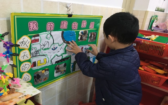 在秋天真正到来的时节,让孩子们同步参与主题《秋天公园》的建构,前期让孩子们自由发言讲述秋天的公园,通过图片的形式丰富孩子的经验。接着让孩子们参与布局设计,将小组的想法绘于纸上,让建构游戏来的更加形象感,更加规划性。