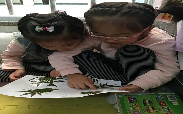秋叶粘贴画是秋天美的缩影,我们将美渗透于阅读区中,瞧,孩子们你一言我一语,观察叶的形态,品味茎叶的奥秘。一幅幅静态的作品变成了孩子们口中动态讲述的故事,“秋姑娘来到池塘边,芦苇叶子晃动着......”“稻草人在田野里举着手臂,路过的大雁......”
