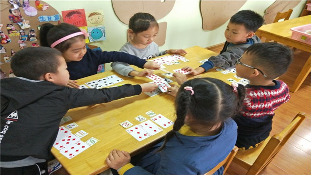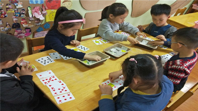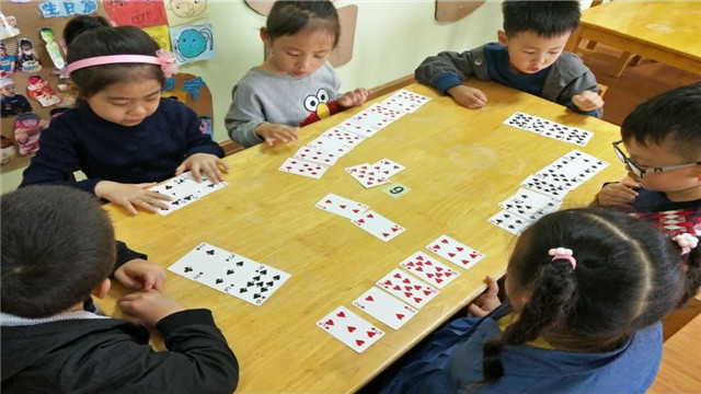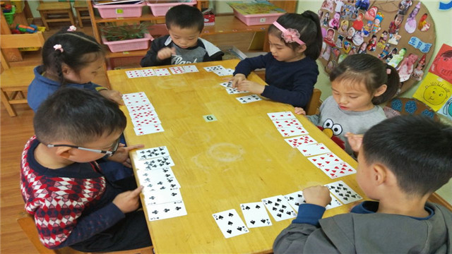 扑克牌是可谓是一种廉价的、传统的、益智游戏。孩子们一起玩纸牌,在一种轻松、随意的气氛中,在有心与无意之间激发孩子对数学、数字的兴趣,培养孩子逻辑能力、思维能力,真是一举多得。(发文者:王琰 张繁)