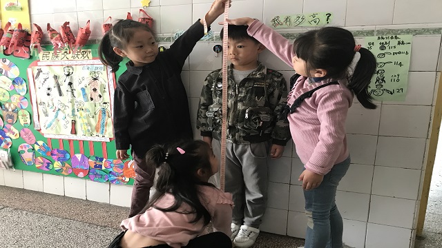孩子们一开始只知道双脚并拢,脚跟靠墙,用手按着头,有模有样地相互比划着,可是谁都说不出来自己到底有多高。这可把孩子们急坏了,于是我们老师参与进去,和孩子们一起讨论起来:测量身高的时候,我们可以借助什么工具呢?此时,好多孩子都不约而同地提到“皮尺”。于是,孩子们找来了皮尺,4个小伙伴一组,测量身高的活动正式开始啦!一个孩子双脚并拢、脚跟靠墙,眼睛平视正前方,另外两个孩子负责拉直皮尺,其中一个牢牢地将皮尺靠紧地面,另一个将皮尺拉得高高,最后一个小朋友就负责用手比划身高,准确地报出受测小朋友的身高。最后,受测小朋友将自己的身高用笔记录下来。就这样,一轮测下来,好多孩子的手臂都酸了,但是当他们看到“身高记录表”上的数字的时候,他们的脸上都露出了开心的笑容,好多小朋友都说:“哇,我又长高了!”