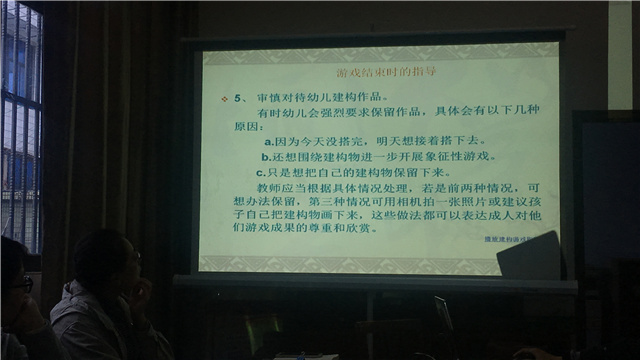 活动中,周老师首先提出幼儿园开展建构游戏的思路,以小、中、大班分别对应单元建构、立体建构、创造性的主题建构。接着,周老师引出提问:建构游戏中常用的材料有哪些?如何合理利用?老师们都纷纷发表了自己的意见和看法,研讨氛围非常浓烈,大家提出了自己在开展建构游戏中的困惑。最后,周老师分别带老师们学习了游戏前的准备和指导、游戏中的指导、游戏结束时的指导,一一解决了老师们的困惑,活动的最后以一个其他幼儿园的建构游戏视频,通过让老师们观察、学习,从而让老师们在之后的建构游戏活动中能更好地学会指导幼儿。