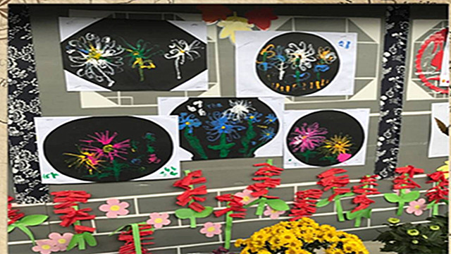 利用家长资源,孩子们带来了许多菊花,顿时走廊变成了一个小型的菊花展,吸引孩子们晨间、午后都围在菊花那里互相介绍自己的菊花。当孩子们还沉浸在对菊花的谈论中我们趁热打铁,请幼儿对看过的菊花进行描述和绘画。有幼儿选择了用水彩笔,有幼儿选择了棉签画,他们边画边讨论自己看到的菊花。画完后,我们把幼儿的作品贴到了墙上,让幼儿欣赏自己的作品。