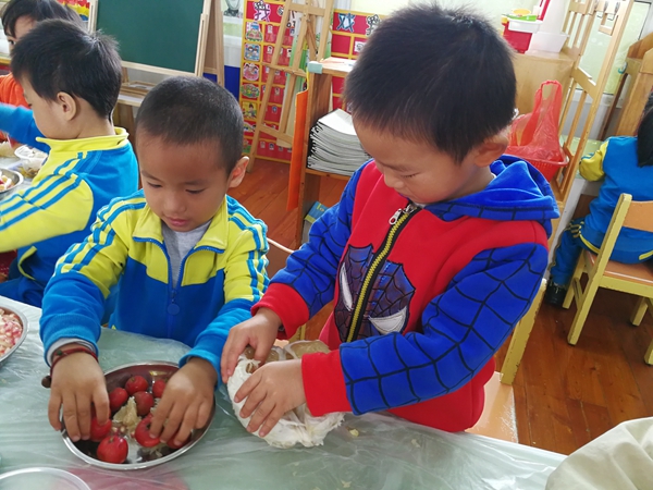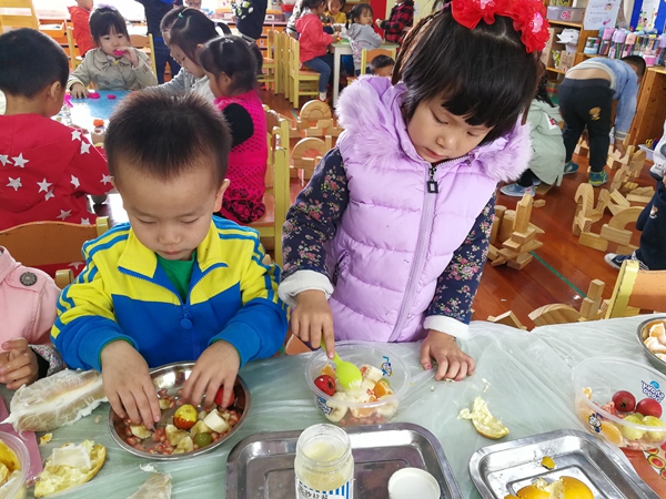 活动一开始,孩子们将带来的水果按种类的不同进行分类,将苹果、橘子、柚子、香蕉等分好后一一摆在盘子里,接着是制作水果拼盘,这是孩子们比较感兴趣的一个活动,孩子们自己剥橘子、拨香蕉皮、切苹果、梨等。在民主、平等而热烈的氛围中,孩子们自己动手制作了一个果盘,他们不仅尝到了水果的香甜,也体验到了成功的喜悦。另外孩子们还动手制作水果沙拉,水果沙拉可以说是孩子们喜欢的一种食物,为了让幼儿了解水果沙拉的制作方法,我将整个操作过程分成切水果、把水果放在碗里、将沙拉酱和水果搅拌、制成水果沙拉四个阶段,要求分组的孩子分工合作,操作时组内孩子相互配合,能力强的孩子制作重要部分,能力弱的孩子制作简单部分,达到共同提高。在老师地指导下,美味的水果沙拉做好了。
