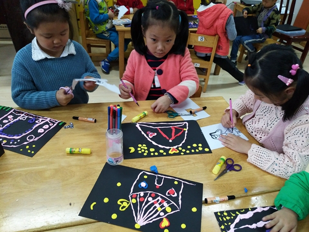 为了让作品更具生动性,幼儿还利用彩笔进行绘画:爸爸妈妈带着宝宝一起唱着歌跳着舞;孩子们在一起围着篝火跳起了舞;还有的小朋友躲在帐篷里说着悄悄话…………星空下的帐篷节在孩子们的手中别提有多热闹了。