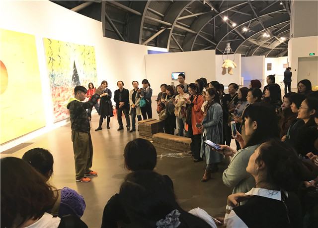 会议开始前,老师们在夏涓老师的带领下,参观了南艺美术馆三楼,这里将是布展的地点,张笑老师介绍了布展时所用的材料——蜂窝板,并向老师讲解说明了蜂窝板的摆放、搭配及整个场馆作品的摆放。他将打破以单位为主的展览模式,采用集体合作的方式进行布展,他希望参展的三十二个单位能齐心协力,互帮互助,把画展真正变成孩子们自己的画展。