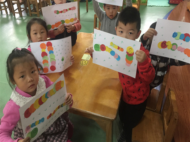 孩子们通过毛毛虫粘贴、手指印画激发了他们对美术活动的兴趣,学习粘贴、手指印画画的基本方法,并能大胆作画。