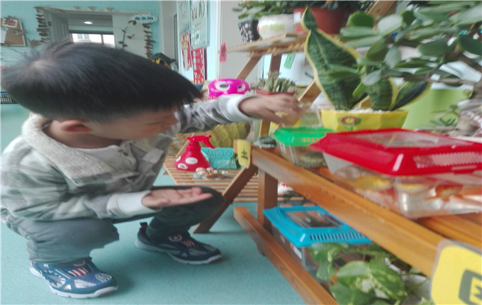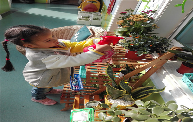 小班幼儿对周围的一切事物都充满好奇,每一个幼儿都是天生的探索家和科学家。根据孩子的这一年龄特点,小班年级组的每个班级都开展了富有特色的照顾自然角的活动。有的班级在自然角中有意识的准备了不同类型的植物:孩子常见却没怎么关注过的土豆、山芋、茨菰;绿意盎然的绿萝、芦荟、多肉植物;有漂亮花朵的长寿花、茶花、喇叭花等。根据不同植物的习性与孩子们共同制作提示浇水的标签:数字表示礼拜几需要浇水,小雨滴的点数表示浇水的多与少。“老师,土豆发芽啦。”“老师,芦荟渴了我给它浇点水。”“老师,绿萝生病了叶子变黄了,我心里有点难过。”有的班级别出心裁,与孩子们一起将植物宝宝种在闲置的皮包、鞋子、小花篮、玻璃罐中,为美丽的植物角增添了一抹创意与美丽。还有的班级在自然角中通过照顾、喂养小乌龟、小金鱼等激发孩子爱小动物的情感。每一天,都有不少孩子来到自然角看看这、瞧瞧那,用自己的眼睛在寻找着自然角里的小秘密。“小乌龟,今天带来了你喜欢的龟粮,你多吃点。”虽然植物和小动物们不会和孩子们对话,但是他们以自己的方式告诉小朋友:“瞧,我是什么样的。”“看,我今天又有了新的变化。”孩子们在观察、照顾的过程中成为了主动探索者,感受着自然界中生命的神奇魅力。