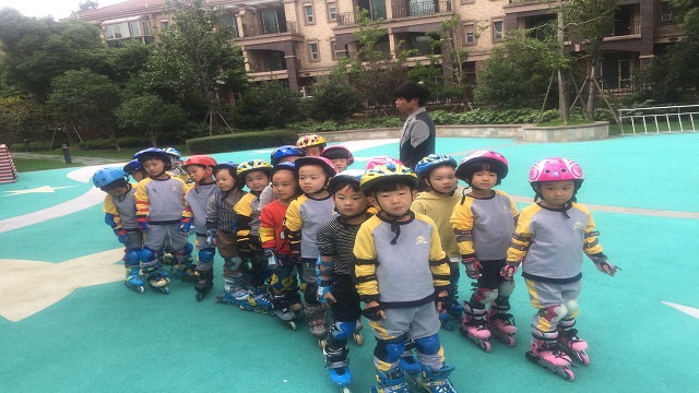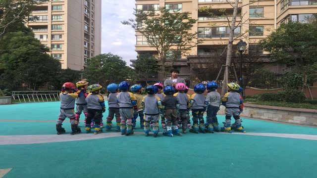 “咱们比一比,看谁倒溜得快!”“好孩子,滑得真棒,再来一圈!”在和幼的操场上总能听见这样的话语。每周一中三班的小朋友都兴奋不已,一个个小朋友身着运动装,脚蹬轮滑鞋,在轮滑教练的指导下,娴熟地做着各种花样动作,时而传来孩子们欢乐的笑声。“轮滑跳跃必须掌握动作技巧,在跳之前先膝盖弯曲,重心放低,起跳时两腿瞬间伸直,身体往上,等到脚离开地面后,膝盖越靠近胸部越好,落下时两脚一前一后分开着地,确保重心平稳。”教练边给学生做示范边耐心地给孩子们讲解轮滑跳跃技巧。