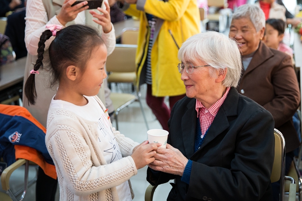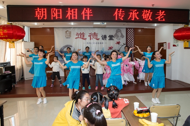 在接下来的活动中,孩子们为爷爷奶奶献茶、剥水果,你喂我一口,我喂你一口,画面就在这一刻静止;我对爷爷奶奶说一句祝福的话,爷爷奶奶将孩子们拥入怀中,还拿着手机纷纷要求合影,画面别提有多温馨感人了……最后,老少同台,在一曲《感恩的心》中画上了完美的句号。