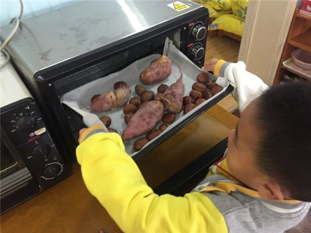 终于过了半个小时,带着厚厚的手套打开烤箱的门,拿出烤盘,食物的香气愈加浓烈。稍等片刻之后,等番薯和大栗冷一冷,分别打给小朋友们,让他们尝尝自己烤出来的大栗和番薯是啥味道。“好甜呀、好甜呀、好甜,真是太好吃了!”小朋友们激动地说道。