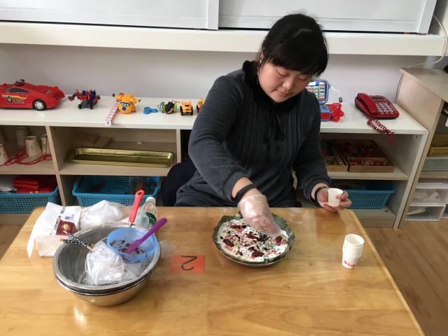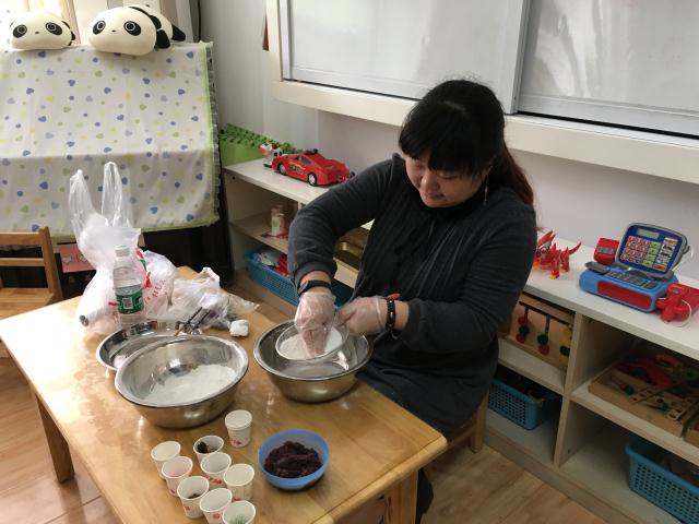 为了让孩子们更加贴近节日,享受节日带来的快乐,中班年级组开展了一次家长助教活动——巧手制作重阳糕。一大早,助教的妈妈就忙碌起来,准备好了制作重阳糕所需的丰富多样的各种食材:有糯米粉、芝麻、红丝绿丝、蜜枣、瓜子仁……材料准备好了,可是该怎么做呢?别急,看看助教的妈妈是如何大显身手的。瞧!她先将糯米粉调匀,铺在容器里,然后铺上豆沙,豆沙上面再盖一层糯米粉,最后放些芝麻、红绿丝、蜜枣等,重阳糕就做好了。助教的妈妈一边制作一边讲述着流程:调粉、成型、放食材。孩子们聚精会神地听着、看着、学着,想着这些制作好的重阳糕会给社区的老人们送去一份温暖的祝福,每个孩子的心里乐开了花!