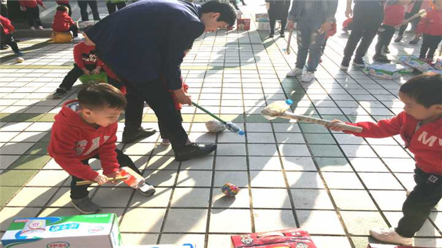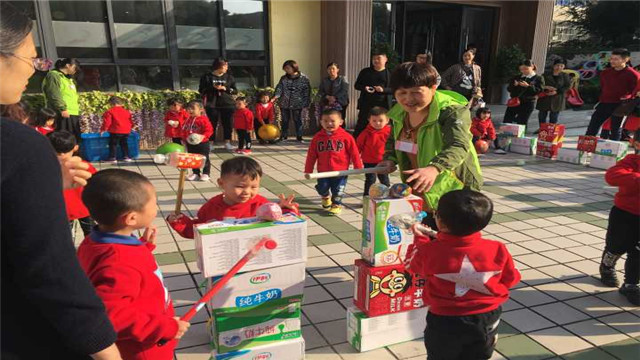 瞧!在晨锻中,有的宝贝用纸箱堆叠,再用小棒敲倒,忙碌而快乐着;有的宝贝拉着小车送小动物回家;有的宝贝跳着羊角球你追我赶好不热闹;有的宝贝赶着小球穿越城墙高兴欢呼。在集体活动中,宝