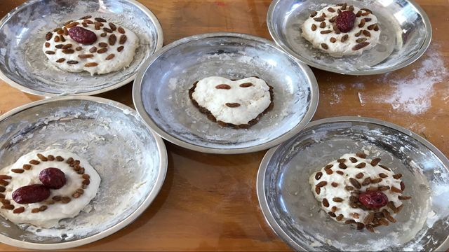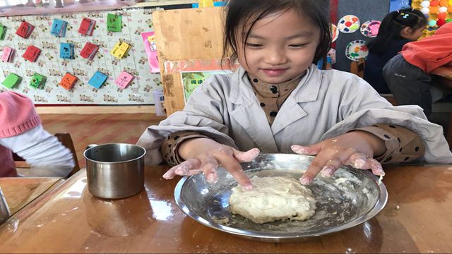 今天,红东幼儿园大班的小朋友要亲手为自己家里的爷爷奶奶做一份重阳糕,首先小朋友们在粳米粉里慢慢的加入水,然后拿个小筷子搅啊搅啊,越搅拌越粘,慢慢的小朋友的小手也变得粘粘的。小朋友看着白白的粉神奇的变成了一整块,说不出的兴奋。然后小朋友们用小手把面团捏成了各种形状,有圆形还有心形。最后,小朋友用好吃的葡萄干和甜甜的红枣给揉好的面团做了美美的装饰。这样一个好看又美味的重阳糕就做好了。