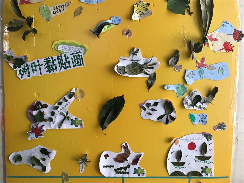 孩子们拿着捡来的树叶创作树叶创意画,一块块展示板被贴满了孩子们的树叶创意画,画面生动有趣。