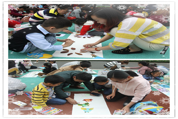 一切准备就绪,我们带着刚制作好的树叶相聚操场,以班级为单位,一起来制作长卷树叶拼贴画的艺术品。瞧:可爱的松鼠、漫步的螃蟹、骄傲的小猫一家……一幅幅美丽的作品让人感受到了亲子制作的快乐以及长卷画的大气凛然。