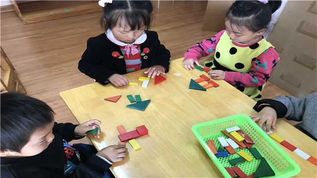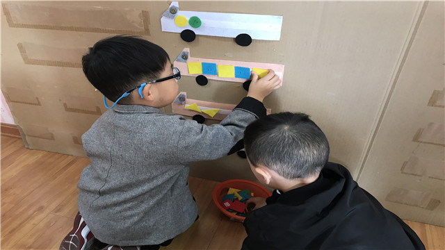 根据幼儿的年龄特点和发展水平设计了美工区、益智区、阅读区、建构区等多个区域。瞧:美工区的孩子在专注的自制图形;建构区的孩子们用几何积木搭楼房;益智区的孩子在给动物喂食物、给货车装货;阅读区的孩子们围在一起翻阅老师自制的大书……区域中老师们投放了丰富而层次分明的区域材料,孩子们自主选择不断地尝试、探索、体验成功和快乐,小小区域,体现了老师们的智慧,孩子们仿佛置身于图形的游戏王国,在游戏中交往、在交往中收获、在收获与分享中体验无穷的快乐。