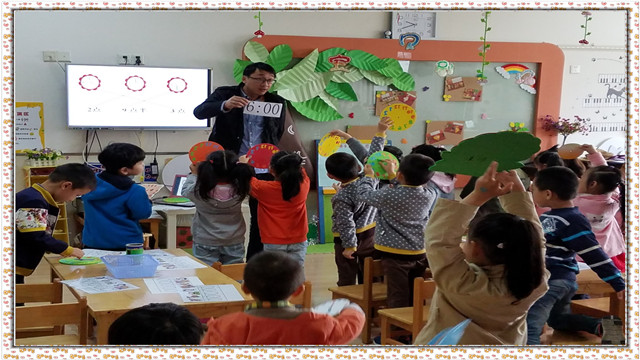 大家都知道数学活动在以往的开展过程中都是十分枯燥的,《认识时钟》这节课是大班上学期需要学会的知识,也是在生活中非常实用的。因此在今天的数学课堂中我们邀请了男家长扮演“大灰狼”,在角色游戏中引导幼儿逐步掌握如何认识时钟。熟悉的儿歌“老狼老狼几点了?”让幼儿很快地回答并拨出了几点,幼儿对这种家长参与课堂教学的方式也甚是喜欢,也让在场的家长们都拍手称赞。
