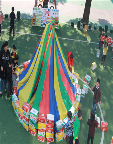 活动开展前,每班对最有特色的的少数民族建筑进行了投票,云南苗族的吊脚楼、西藏藏族的蒙古包获得了小朋友的青睐。每班先商量,用哪些合适的材料进行构建更简单、更形象。最后大家一致决定用旺仔代替竹竿更形象稳固,用硬纸板挖空建阁楼;用梯子撑起蒙古包的顶,用彩虹伞和纸箱构建帐篷和围墙。