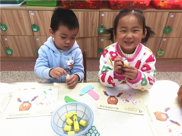 活动中首先要求幼儿撕出大小相近的彩色纸片,然而在现实中,幼儿要么撕得很小,要么撕得一大块。针对这一差异性,我们便想办法,请能力强的小朋友帮助能力弱的幼儿共同合作。让小朋友共同合作中,既习得了这项技能,也从中体会到了合作的乐趣。