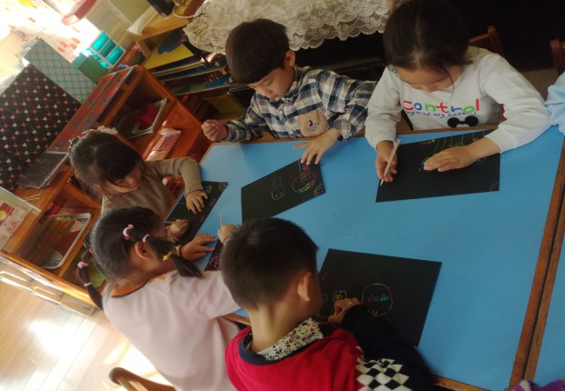 小朋友尝试用刮蜡画的技法表现秋天的树林。接触刮蜡画,激发了孩子们的好奇心,自己能像魔术师一样变幻出美丽的画面,大大提高了幼儿对绘画的兴趣,也体验到不同的作画方式(刮蜡画)带来的乐趣。