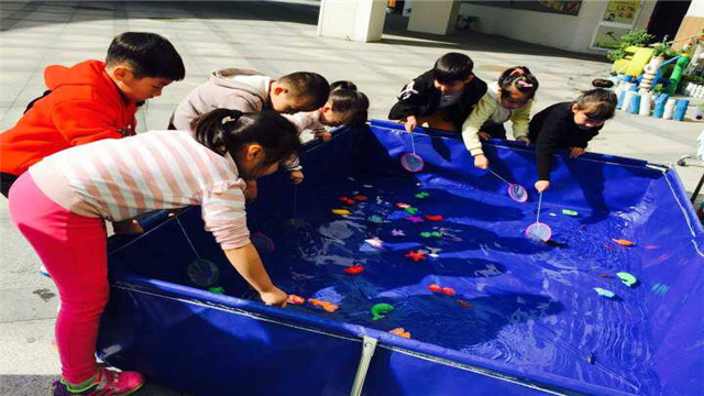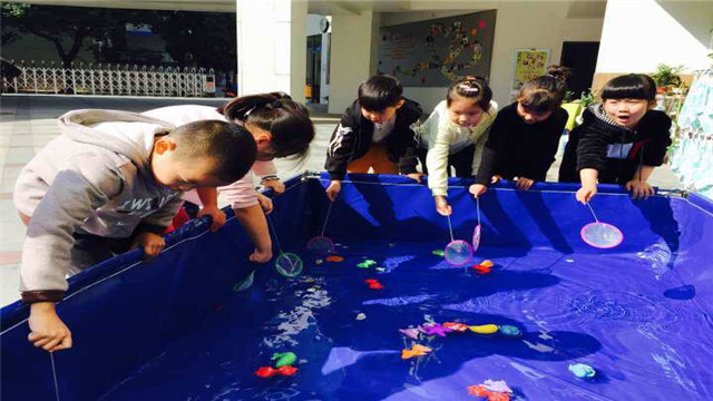 在这个充气池子里我们放入水,投放塑料小鱼和一些小金鱼。不过和池子里的塑料小鱼相比,孩子们更喜欢水里活蹦乱跳的小鱼。他们拿着渔网追赶捕捞同一条小鱼不放弃,对于漂浮在水面的塑料小鱼却无动于衷。过了几分钟还没捞到,有的孩子也会拿着渔网生气地拍打两下水面,终于捕获到小鱼,便会用渔网将小鱼递向老师跟前,等待掌声和夸奖。此时老师在一旁也会进行引导,让他们赶快将小鱼放入装有水的小桶内,并告诉他们小鱼只能生活在水里,离开水面会有生命危险,从而引导他们爱护动物。