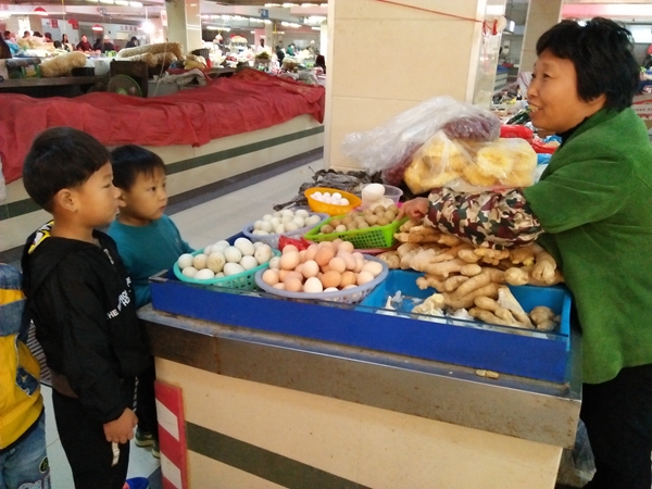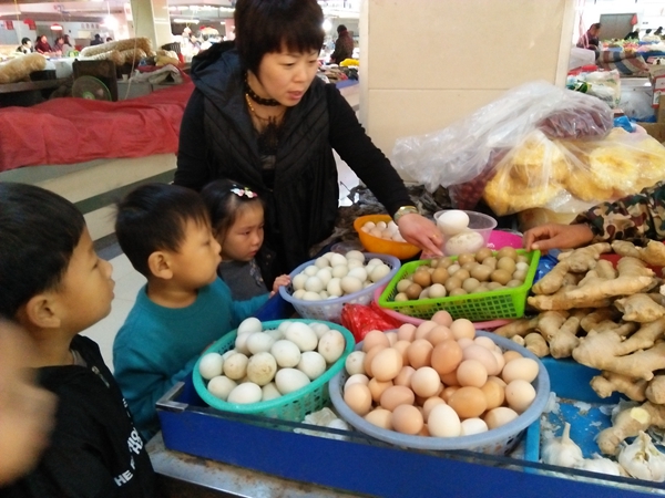 《买菜》是孩子们不久前学会的新歌曲。而今天,郑陆中心幼儿园中班的小朋友一边唱着这首欢快的歌,一边手拉着手儿,真的走进菜场去买菜啦。