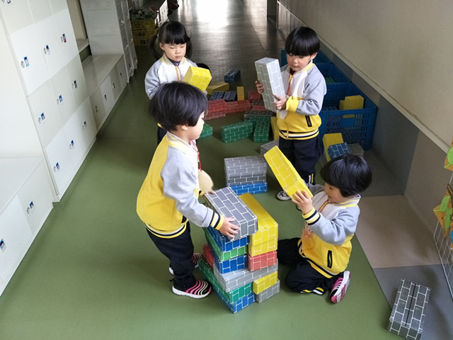 建构游戏是融思维、操作、艺术、创造为一体的活动,小五班在教室里设置建构区外,还利用走廊空间,并提供丰富的纸砖材料,让孩子在动手操作的过程中不断提高建构能力。