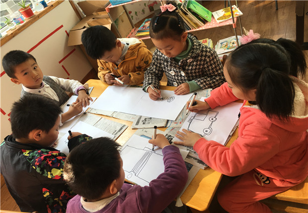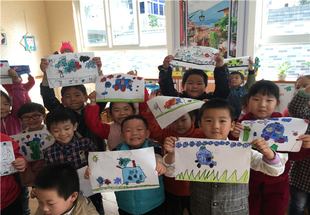 活动中,孩子们通过稚嫩的小手涂鸦来表述他们的所见、所感及所想,让他们的思维活跃,遨游在各自想象的海洋里。看,一幅幅充满童真童趣、活力无限、张扬幻想的画面跃然纸上,每一幅图画都是那样的质朴天然、绘声绘色。有的幼儿用不同的色彩装饰小汽车,有的幼儿画了一辆载有蒙古包的汽车,还有的幼儿画了一辆有螺旋桨的汽车,还有的幼儿一起在画纸两边的空白处进行合作、即兴绘画。画面丰富多彩,小朋友们意犹未尽。