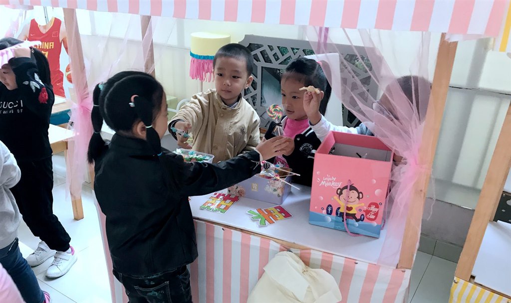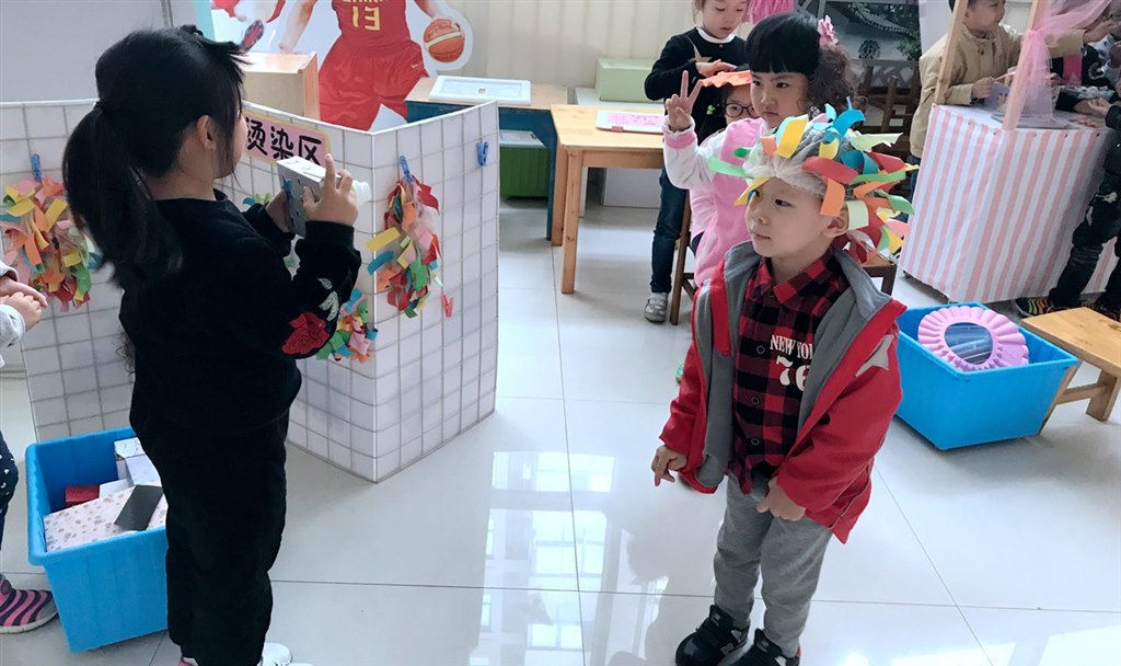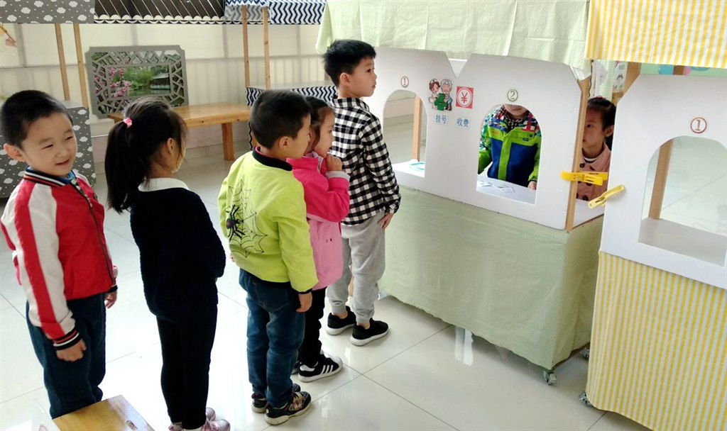 在角色游戏大厅内,设有医院、美发屋、食品店,照相馆等各类现实生活中的场景,孩子们仿佛来到了一个拟真的小社会。一个上午的体验中,老师更多的时候扮演着观众的角色,安静地在一旁看着自己孩子的“成长”。在角色游戏中,孩子们不知疲倦地在几个主题之间来回走动,不断地更换着自己的职业角色。一会儿扮演理发师给顾客理发,一会儿做营业员卖食品,一会儿给人拍照片设计新形象,一会儿扮演医生。他们赚着“钱”,又花着“钱”,体验着大人们的世界,憧憬着成大以后的梦想。
