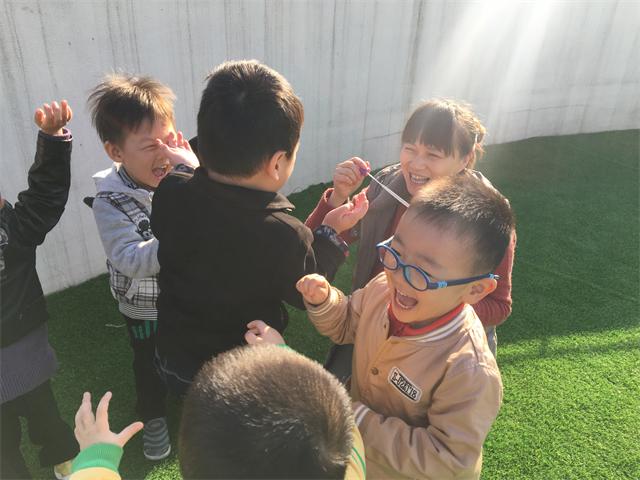 瞧,红梅幼儿园小二班的宝宝们正在玩吹泡泡的游戏呢。当大大小小、五颜六色的泡泡在空中飞舞、飘扬,就会赢得孩子们一声声欢呼、一阵阵惊喜,而后争相去追,从中感受泡泡的色彩、形状及易破等特性,看,孩子们玩得多开心呀!