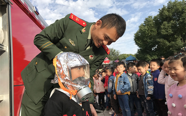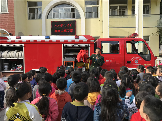 演习后,大家与特邀嘉宾——消防员叔叔进行了一次近距离互动。消防员用形象生动、深入浅出的语言给小朋友介绍了消防车上的小秘密:灭火器、喷水枪、消防服等消防器材和使用方法,并针对灭火器的使用进行了生动细致的讲解,孩子们表现出了浓厚的兴趣,目不转睛地看着,聚精会神地听着,一双双眼睛写满了对消防员叔叔的赞美与钦佩!小朋友们还在消防员的指导下试用了消防装备,使孩子们形象地学习到生活中常用的消防安全知识。