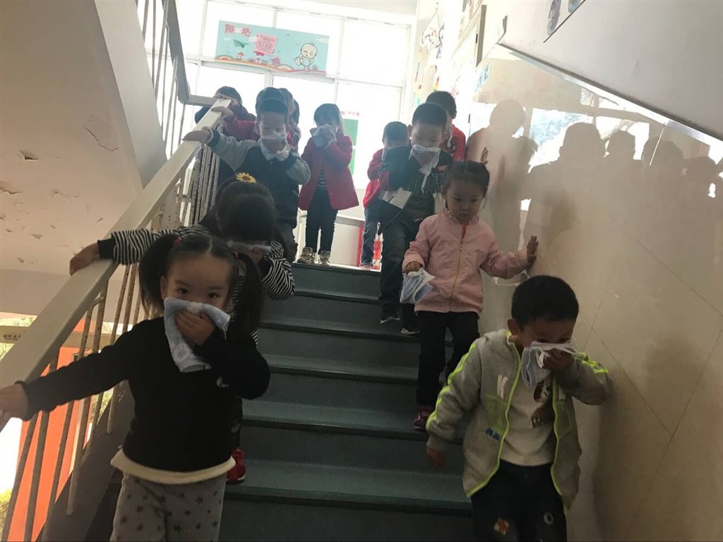 首先,全体师生开展了消防演练,在消防疏散演习中,随着警报声的响起,幼儿在老师的带领下迅速用湿毛巾捂住口鼻,弯腰俯身,紧张而有序的按预定要求与路线疏散。快速、安全的完成撤离。
